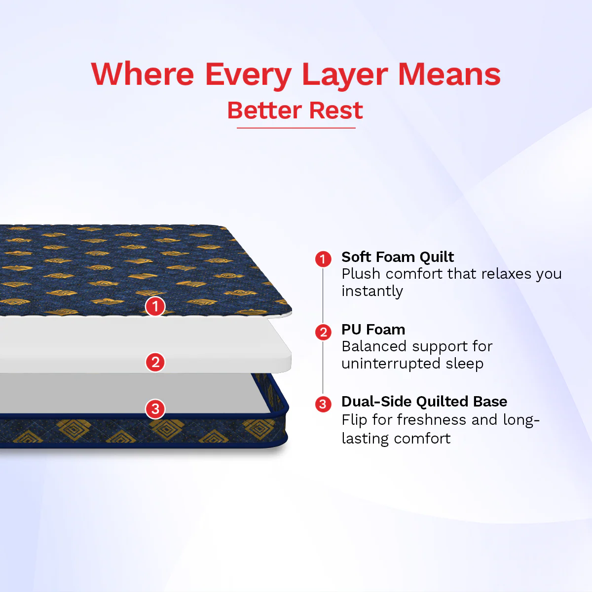 - Dual-Side Quilted Base:Â Quilting on both sides allows you to flip the mattress for extended life and freshness.